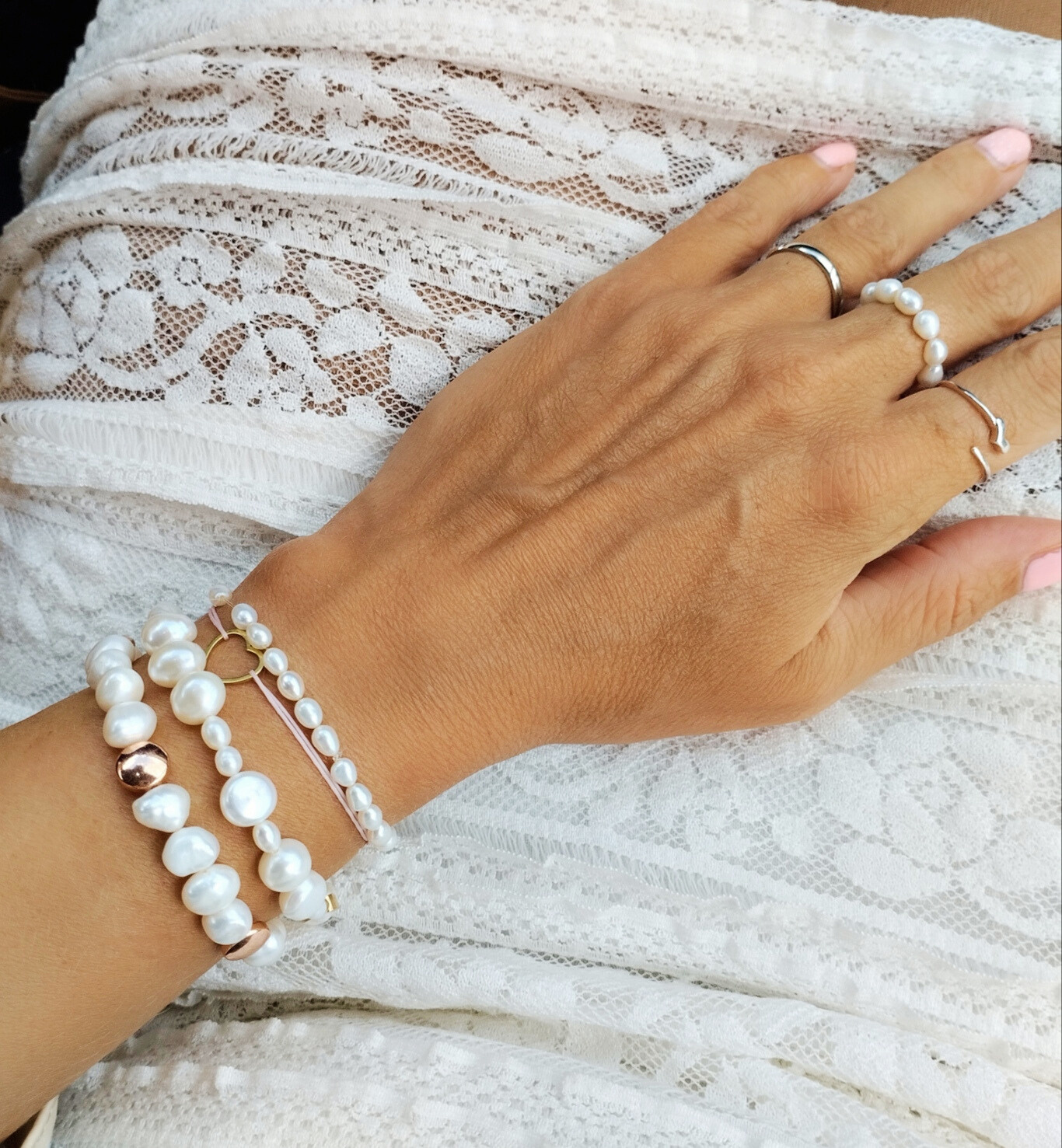A tenyésztett gyöngyös ékszereimet nemesacél szerelékkel készítem, így biztosan időtálló darab lesz, nem kopik, nem fog a szerelék rész.